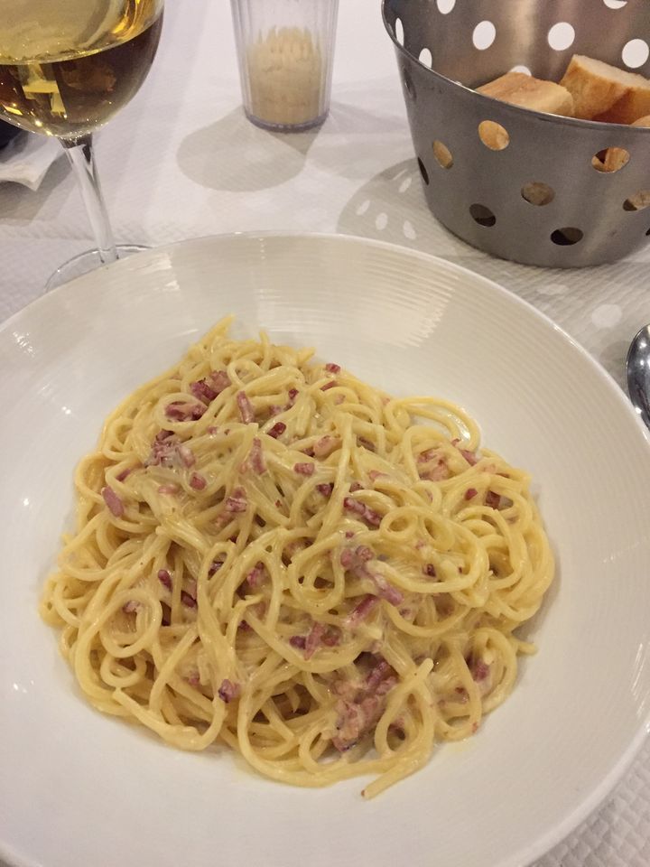My eyes and feet find their way into La Trattoria. The wood panels and white table cloths seem almost too upscale for my casual dress this evening, but no one cares. As I order carbonara and wine, the chef makes pizza fresh next to me pounding the dough, sprinkling the sauce and placing the pie in the oven.